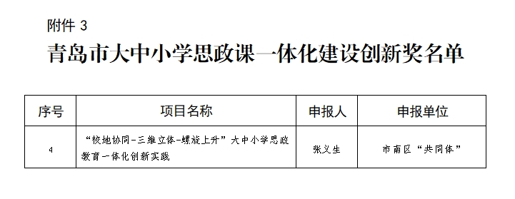 马克思主义学院张义生申报的《“校地协同-三维立体-螺旋上升”大中小学思政教育一体化创新实践》获评大中小学思政课一体化建设创新奖。