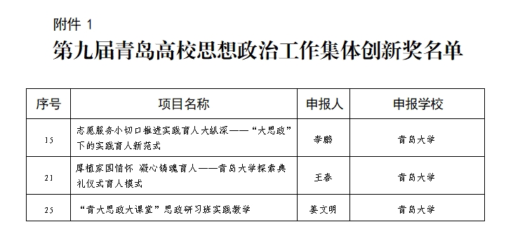 校团委申报的《志愿服务小切口推进实践育人大纵深——“大思政”下的实践育人新范式》、党委学生工作部申报的《厚植家国情怀 凝心铸魂育人——青岛大学探索典礼仪式育人模式》、马克思主义学院申报的《“青大思政大课堂”思政研习班实践教学》获评青岛高校思想政治工作集体创新奖。
