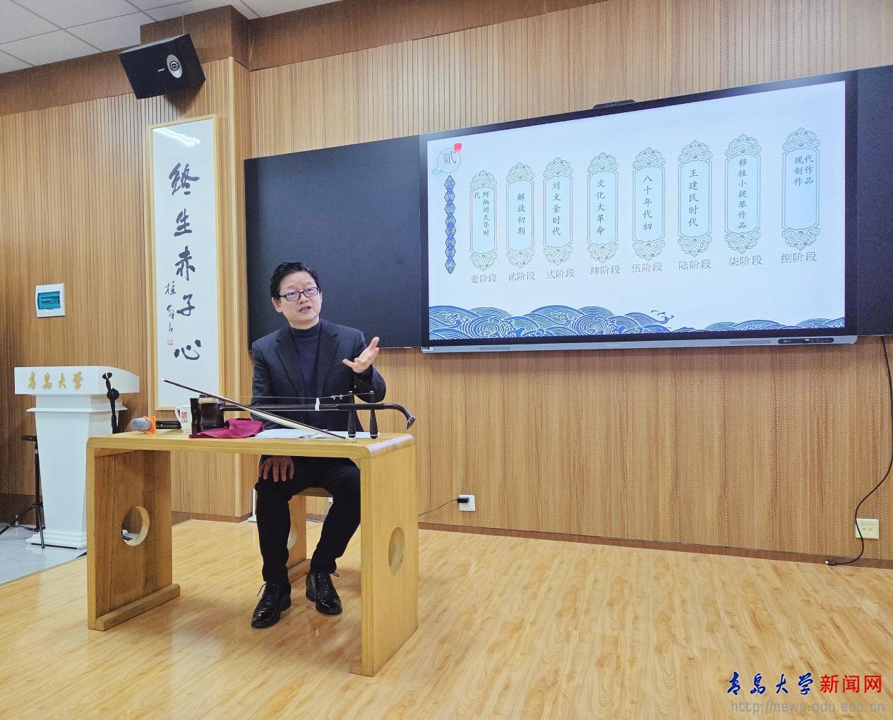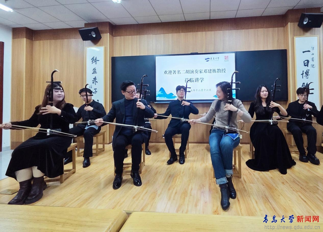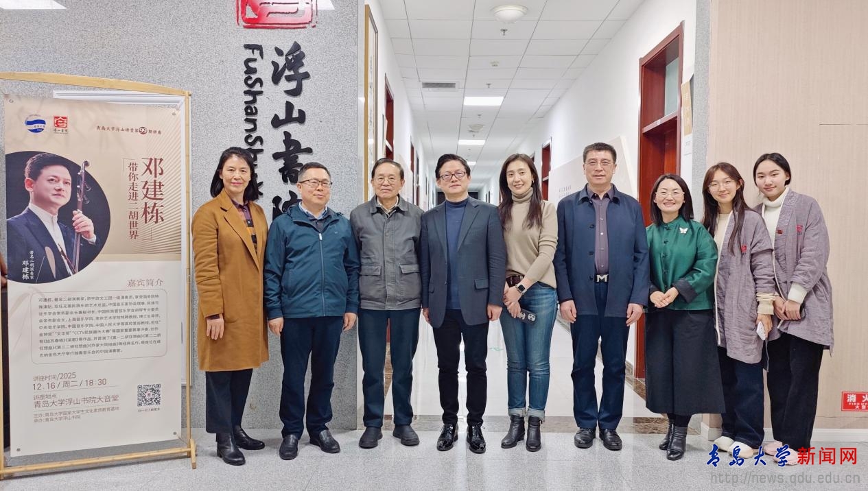 新闻网讯 12月16日晚,受我校国家大学生文化素质教育基地邀请,著名二胡演奏家邓建栋教授做客浮山讲堂第99期,在浮山书院大音堂为近百名中外师生呈现了一场融合历史讲解、作品解析与现场演奏的国乐文化盛宴。本次讲座由浮山书院承办,是我校艺术学院王娟娟老师主讲的美育课程《中国民族器乐艺术》的特色教学活动之一。青岛市人大常委会专职委员、一级巡视员王为达,我校原党委书记夏临华,以及教务处、离退休工作处、艺术学院、国际教育学院等部门的相关人员出席活动。